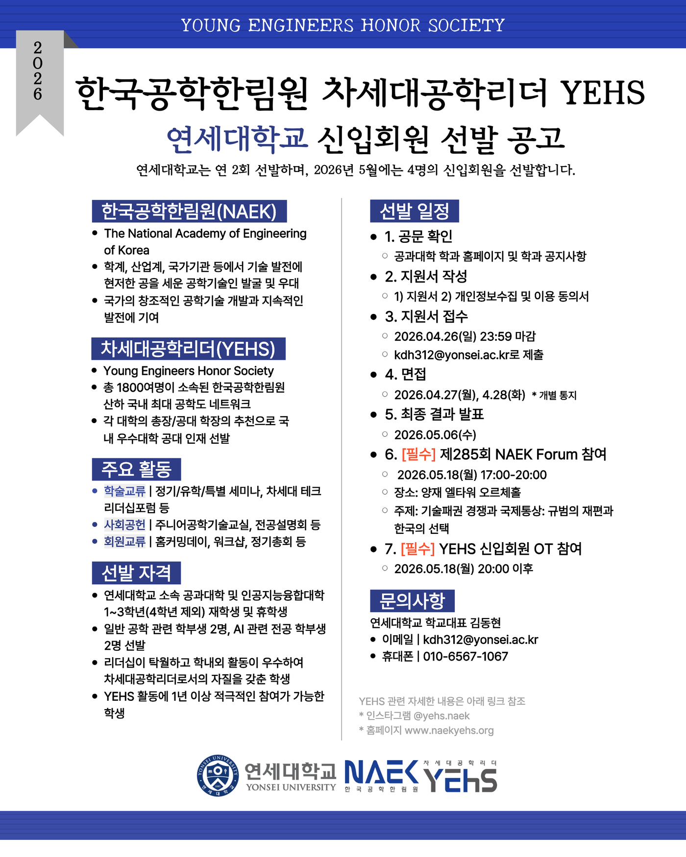 ** 신청자는 반드시 2026.5.18(월) 한국공학한림원 NAEK 포럼과 YEHS 신입회원 OT에 참석 가능해야 합니다(세부 일정 파일 참조).